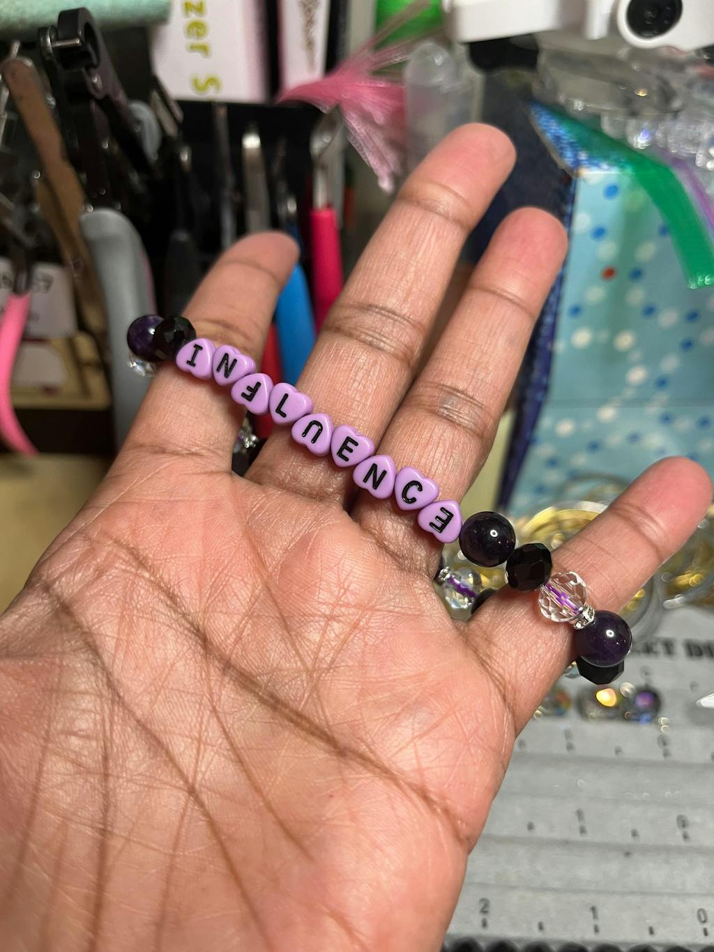 Lavender acrylic beads with black lettering